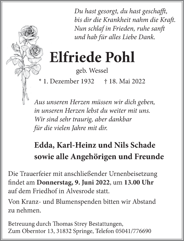 Hier finden Sie alle Traueranzeigen aus der Zeitung, die bisher für Elfriede Pohl erschienen sind. Weitere Traueranzeigen, die in der Zeitung erscheinen, werden hier ebenfalls aufgelistet