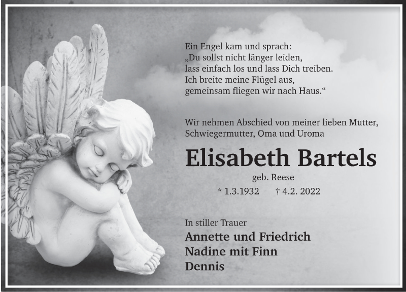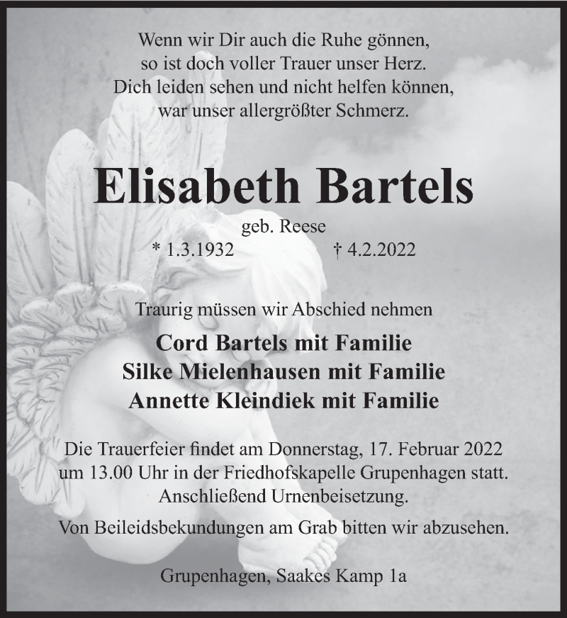 Hier finden Sie alle Traueranzeigen aus der Zeitung, die bisher für Elisabeth Bartels erschienen sind. Weitere Traueranzeigen, die in der Zeitung erscheinen, werden hier ebenfalls aufgelistet