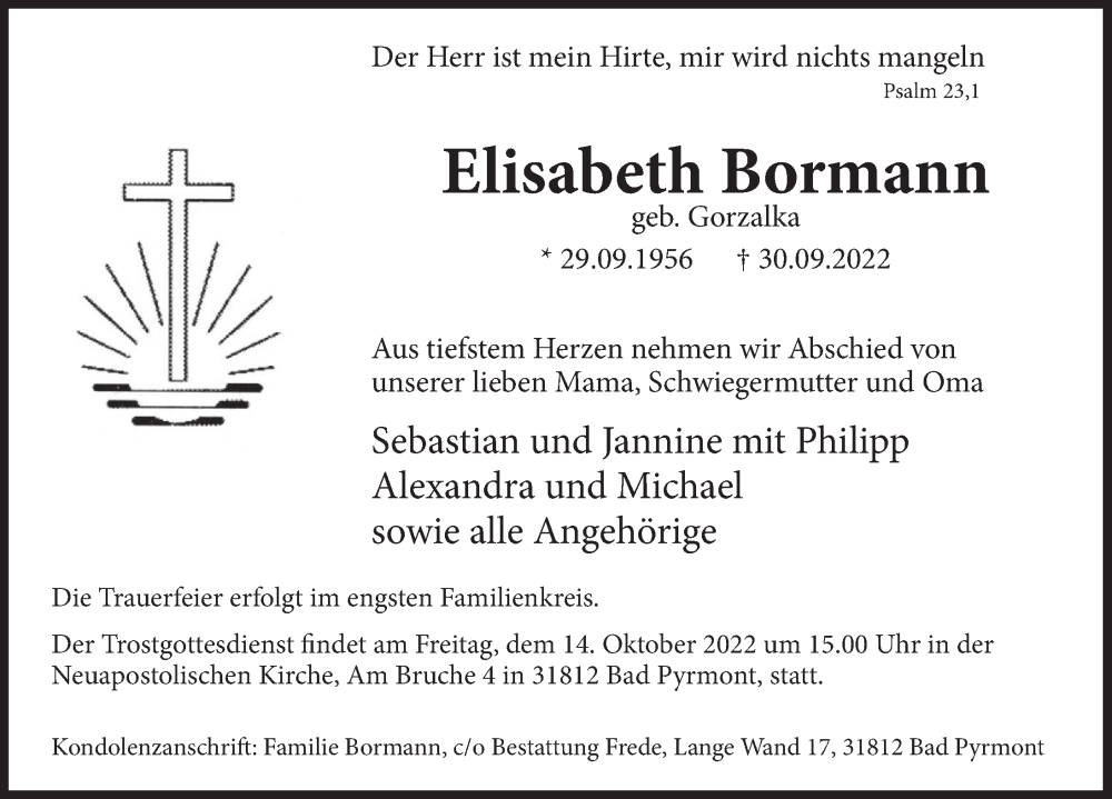 Hier finden Sie alle Traueranzeigen aus der Zeitung, die bisher für Elisabeth Bormann erschienen sind. Weitere Traueranzeigen, die in der Zeitung erscheinen, werden hier ebenfalls aufgelistet