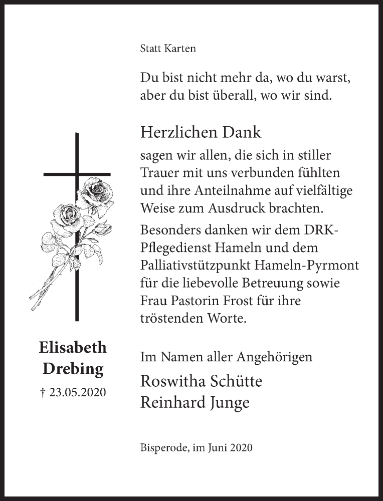 Hier finden Sie alle Traueranzeigen aus der Zeitung, die bisher für Elisabeth Drebing erschienen sind. Weitere Traueranzeigen, die in der Zeitung erscheinen, werden hier ebenfalls aufgelistet