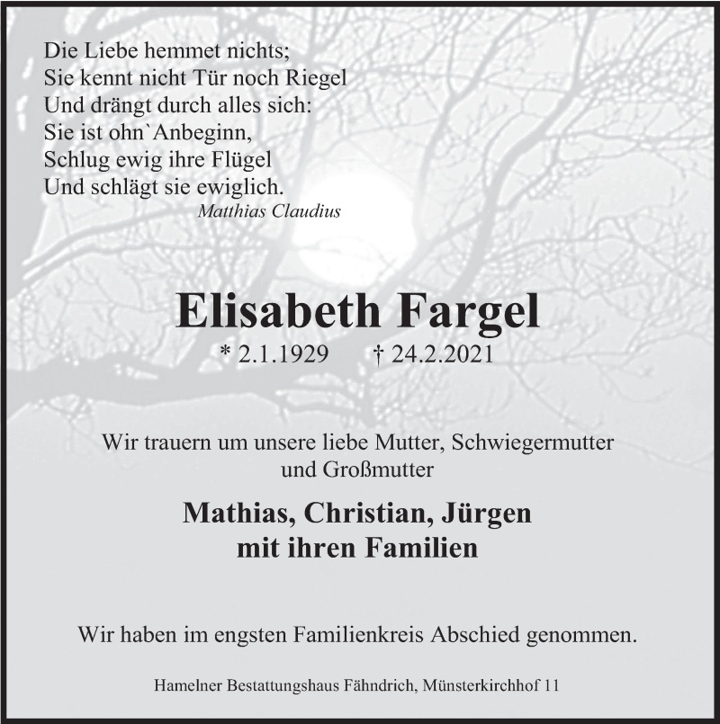 Hier finden Sie alle Traueranzeigen aus der Zeitung, die bisher für Elisabeth Fargel erschienen sind. Weitere Traueranzeigen, die in der Zeitung erscheinen, werden hier ebenfalls aufgelistet