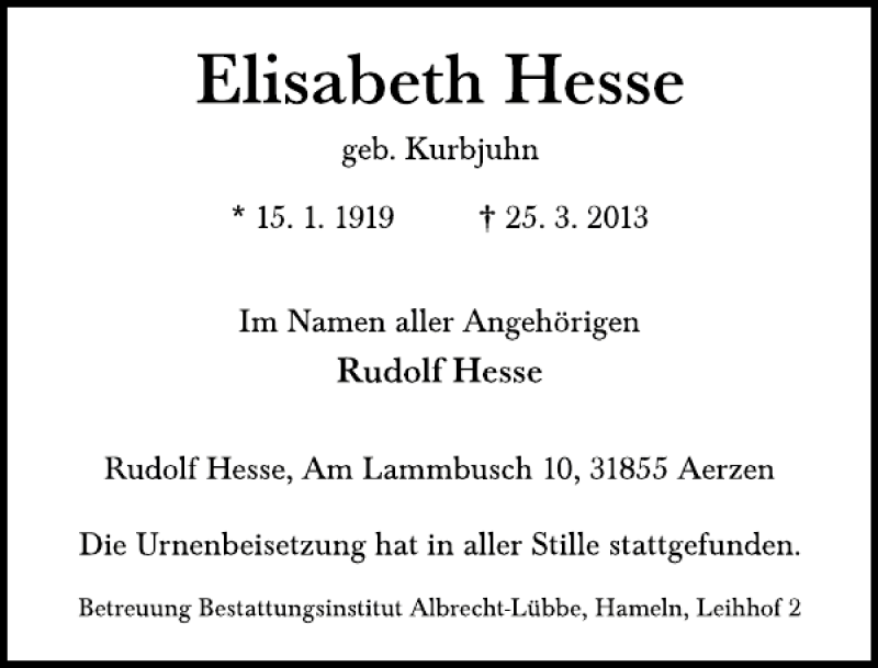 Hier finden Sie alle Traueranzeigen aus der Zeitung, die bisher für Elisabeth Hesse erschienen sind. Weitere Traueranzeigen, die in der Zeitung erscheinen, werden hier ebenfalls aufgelistet