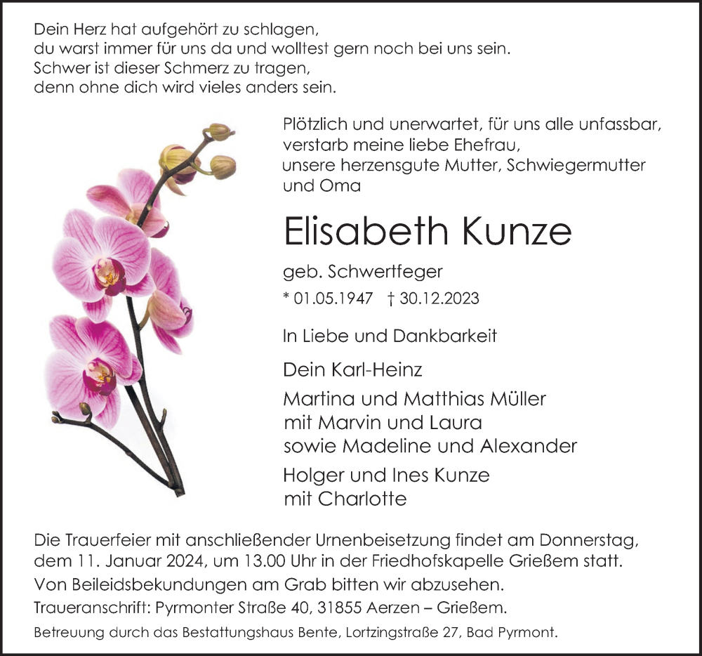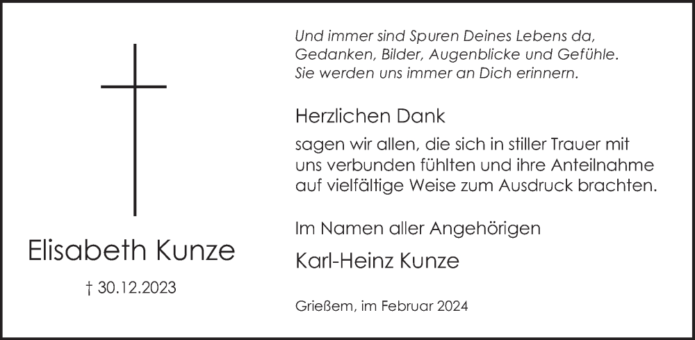Hier finden Sie alle Traueranzeigen aus der Zeitung, die bisher für Elisabeth Kunze erschienen sind. Weitere Traueranzeigen, die in der Zeitung erscheinen, werden hier ebenfalls aufgelistet