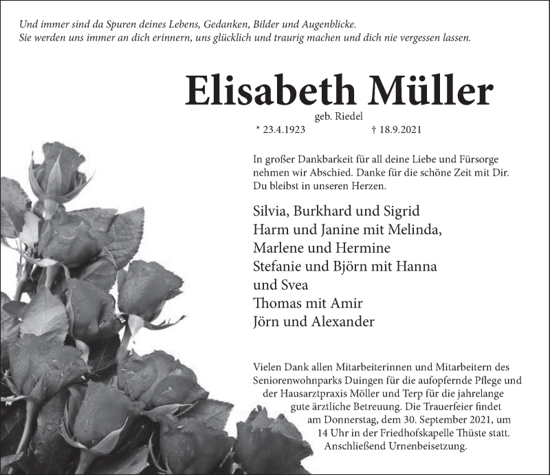 Hier finden Sie alle Traueranzeigen aus der Zeitung, die bisher für Elisabeth Müller erschienen sind. Weitere Traueranzeigen, die in der Zeitung erscheinen, werden hier ebenfalls aufgelistet