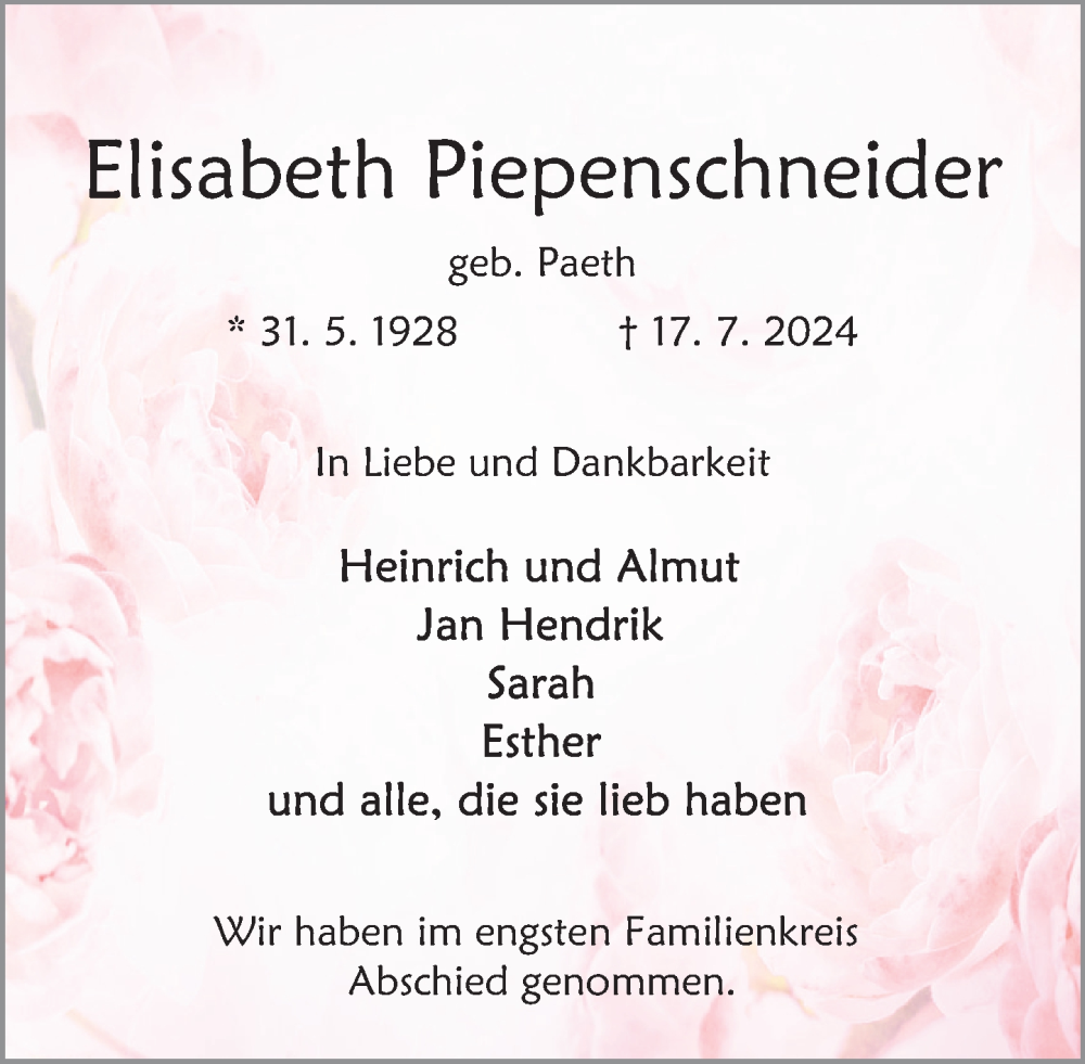 Hier finden Sie alle Traueranzeigen aus der Zeitung, die bisher für Elisabeth Piepenschneider erschienen sind. Weitere Traueranzeigen, die in der Zeitung erscheinen, werden hier ebenfalls aufgelistet