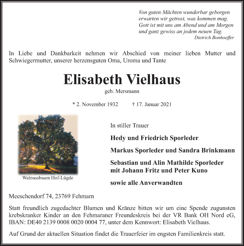 Hier finden Sie alle Traueranzeigen aus der Zeitung, die bisher für Elisabeth Vielhaus erschienen sind. Weitere Traueranzeigen, die in der Zeitung erscheinen, werden hier ebenfalls aufgelistet