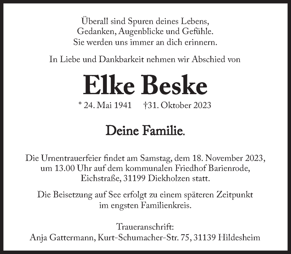 Hier finden Sie alle Traueranzeigen aus der Zeitung, die bisher für Elke Beske erschienen sind. Weitere Traueranzeigen, die in der Zeitung erscheinen, werden hier ebenfalls aufgelistet
