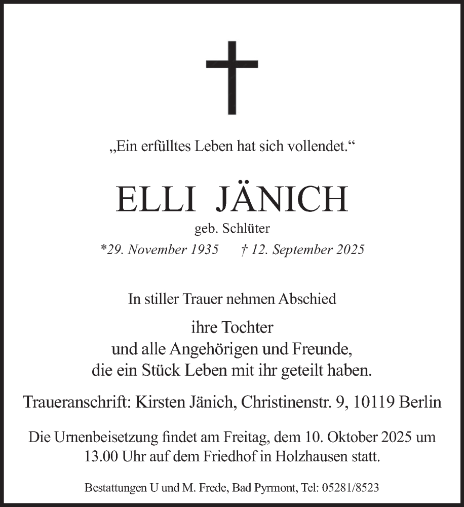 Hier finden Sie alle Traueranzeigen aus der Zeitung, die bisher für Elli Jänich erschienen sind. Weitere Traueranzeigen, die in der Zeitung erscheinen, werden hier ebenfalls aufgelistet