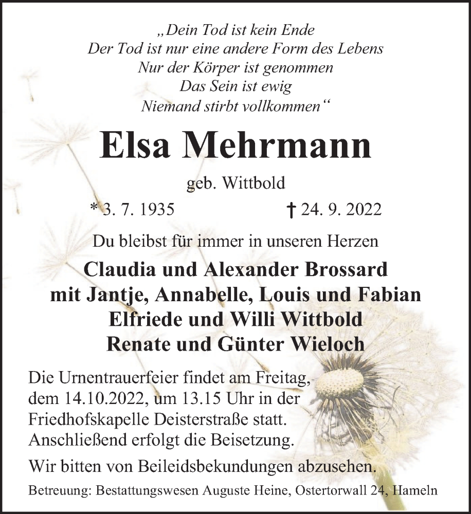 Hier finden Sie alle Traueranzeigen aus der Zeitung, die bisher für Elsa Mehrmann erschienen sind. Weitere Traueranzeigen, die in der Zeitung erscheinen, werden hier ebenfalls aufgelistet