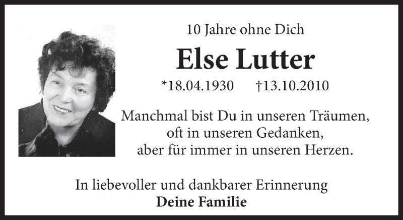 Hier finden Sie alle Traueranzeigen aus der Zeitung, die bisher für Else Lutter erschienen sind. Weitere Traueranzeigen, die in der Zeitung erscheinen, werden hier ebenfalls aufgelistet