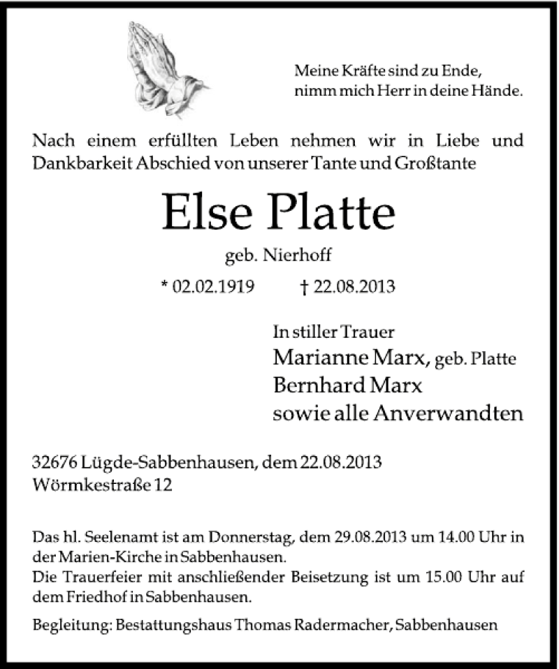 Hier finden Sie alle Traueranzeigen aus der Zeitung, die bisher für Else Platte erschienen sind. Weitere Traueranzeigen, die in der Zeitung erscheinen, werden hier ebenfalls aufgelistet