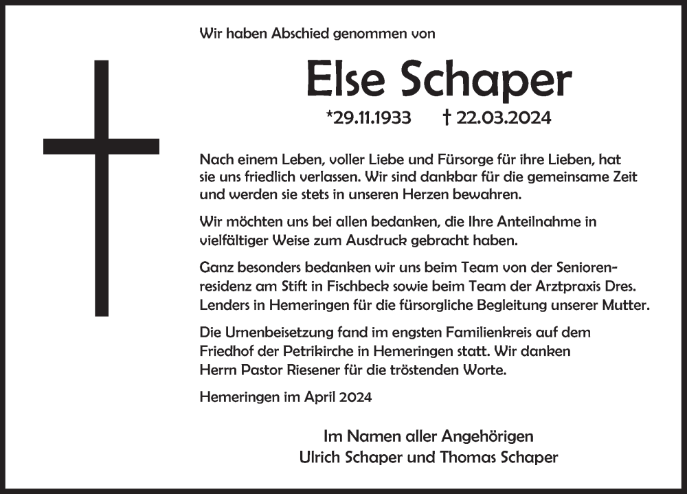 Hier finden Sie alle Traueranzeigen aus der Zeitung, die bisher für Else Schaper erschienen sind. Weitere Traueranzeigen, die in der Zeitung erscheinen, werden hier ebenfalls aufgelistet