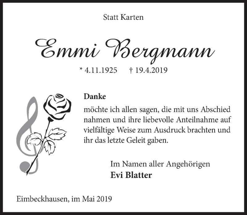 Hier finden Sie alle Traueranzeigen aus der Zeitung, die bisher für Emmi Bergmann erschienen sind. Weitere Traueranzeigen, die in der Zeitung erscheinen, werden hier ebenfalls aufgelistet