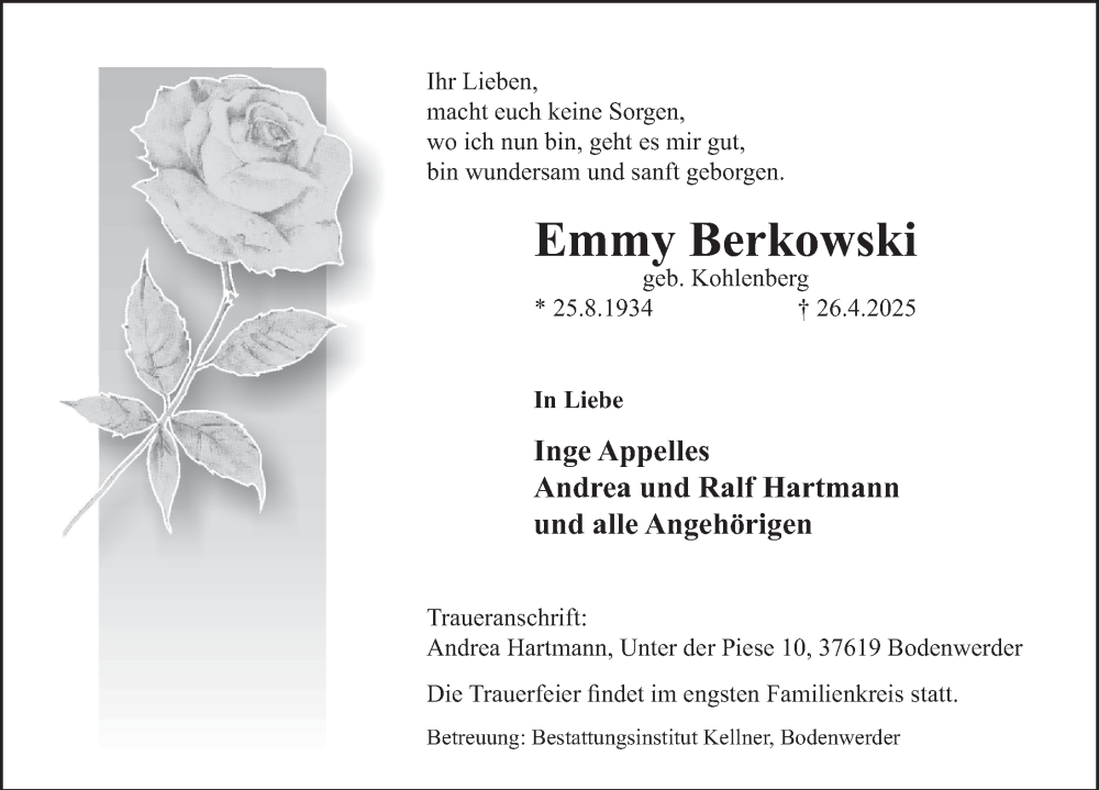 Hier finden Sie alle Traueranzeigen aus der Zeitung, die bisher für Emmy Berkowski erschienen sind. Weitere Traueranzeigen, die in der Zeitung erscheinen, werden hier ebenfalls aufgelistet