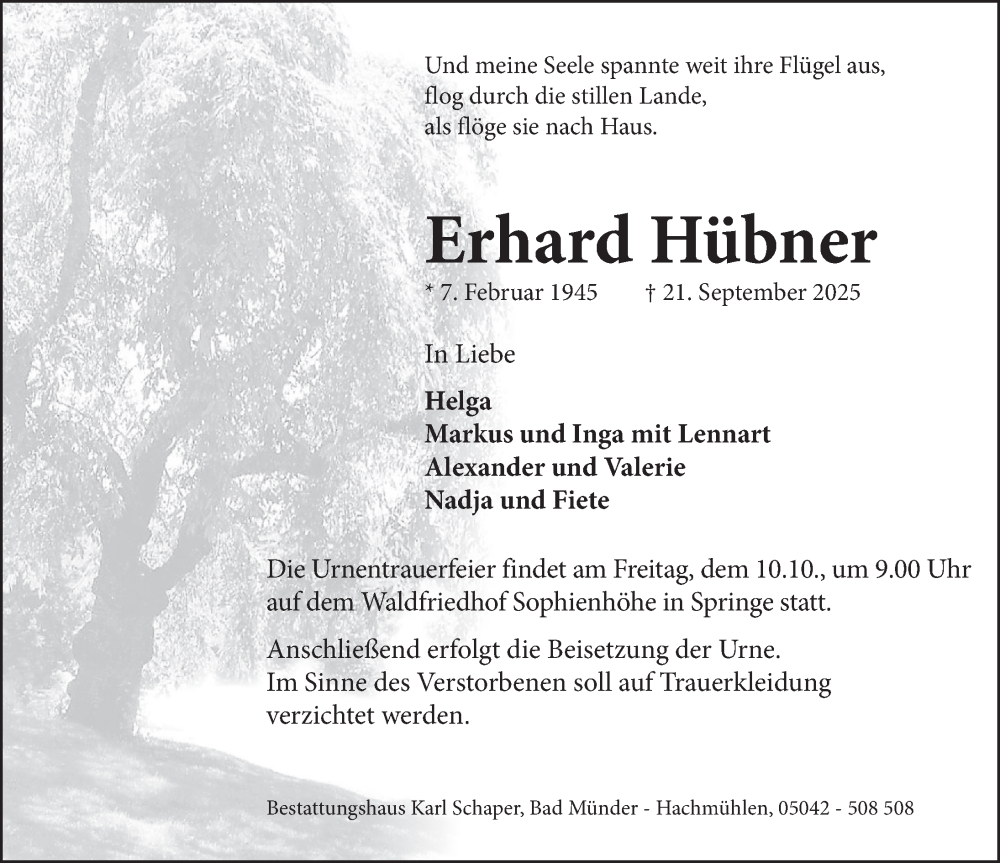Hier finden Sie alle Traueranzeigen aus der Zeitung, die bisher für Erhard Hübner erschienen sind. Weitere Traueranzeigen, die in der Zeitung erscheinen, werden hier ebenfalls aufgelistet