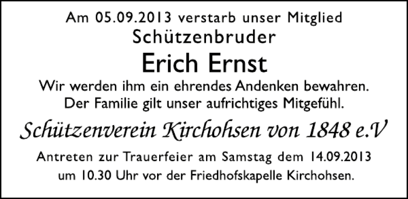 Hier finden Sie alle Traueranzeigen aus der Zeitung, die bisher für Erich Ernst erschienen sind. Weitere Traueranzeigen, die in der Zeitung erscheinen, werden hier ebenfalls aufgelistet