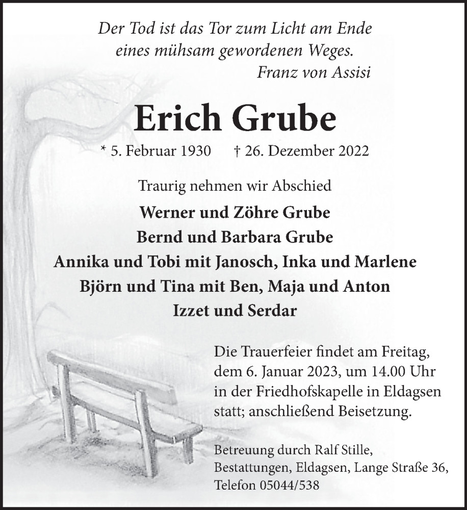 Hier finden Sie alle Traueranzeigen aus der Zeitung, die bisher für Erich Grube erschienen sind. Weitere Traueranzeigen, die in der Zeitung erscheinen, werden hier ebenfalls aufgelistet