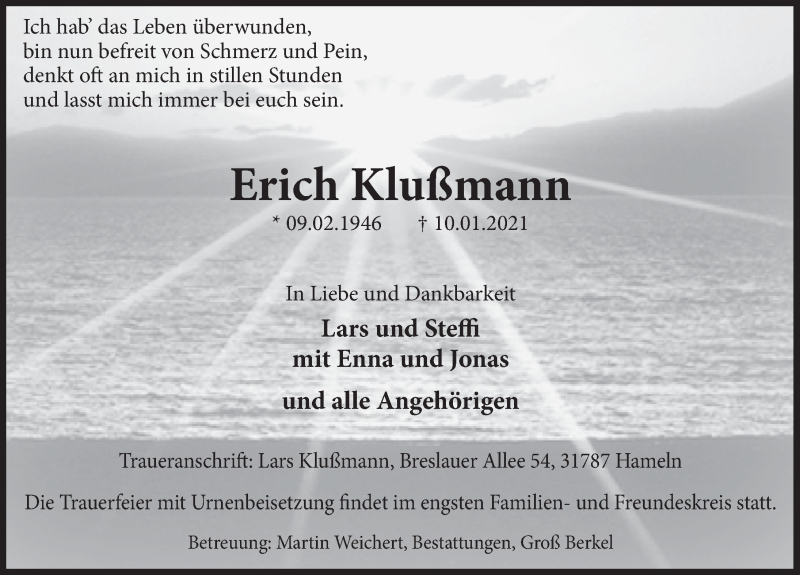 Hier finden Sie alle Traueranzeigen aus der Zeitung, die bisher für Erich Klußmann erschienen sind. Weitere Traueranzeigen, die in der Zeitung erscheinen, werden hier ebenfalls aufgelistet