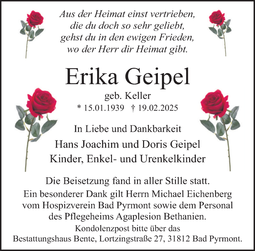 Hier finden Sie alle Traueranzeigen aus der Zeitung, die bisher für Erika Geipel erschienen sind. Weitere Traueranzeigen, die in der Zeitung erscheinen, werden hier ebenfalls aufgelistet