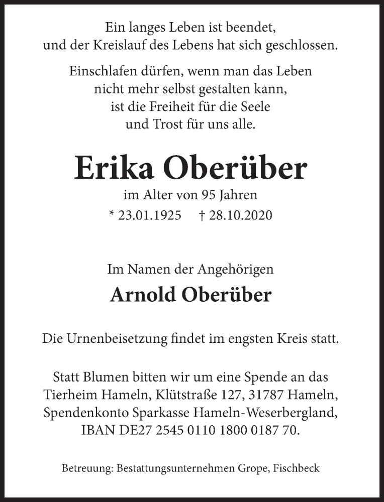 Hier finden Sie alle Traueranzeigen aus der Zeitung, die bisher für Erika Oberüber erschienen sind. Weitere Traueranzeigen, die in der Zeitung erscheinen, werden hier ebenfalls aufgelistet