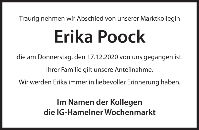 Hier finden Sie alle Traueranzeigen aus der Zeitung, die bisher für Erika Pook erschienen sind. Weitere Traueranzeigen, die in der Zeitung erscheinen, werden hier ebenfalls aufgelistet