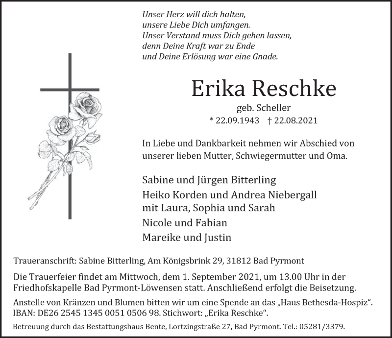 Hier finden Sie alle Traueranzeigen aus der Zeitung, die bisher für Erika Reschke erschienen sind. Weitere Traueranzeigen, die in der Zeitung erscheinen, werden hier ebenfalls aufgelistet