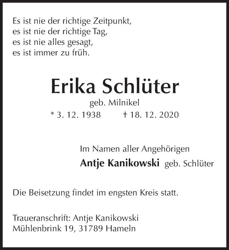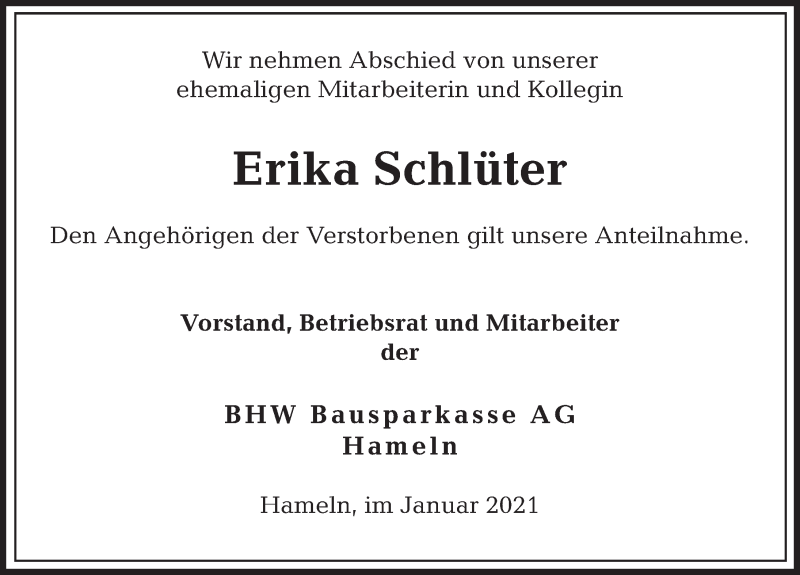 Hier finden Sie alle Traueranzeigen aus der Zeitung, die bisher für Erika Schlüter erschienen sind. Weitere Traueranzeigen, die in der Zeitung erscheinen, werden hier ebenfalls aufgelistet
