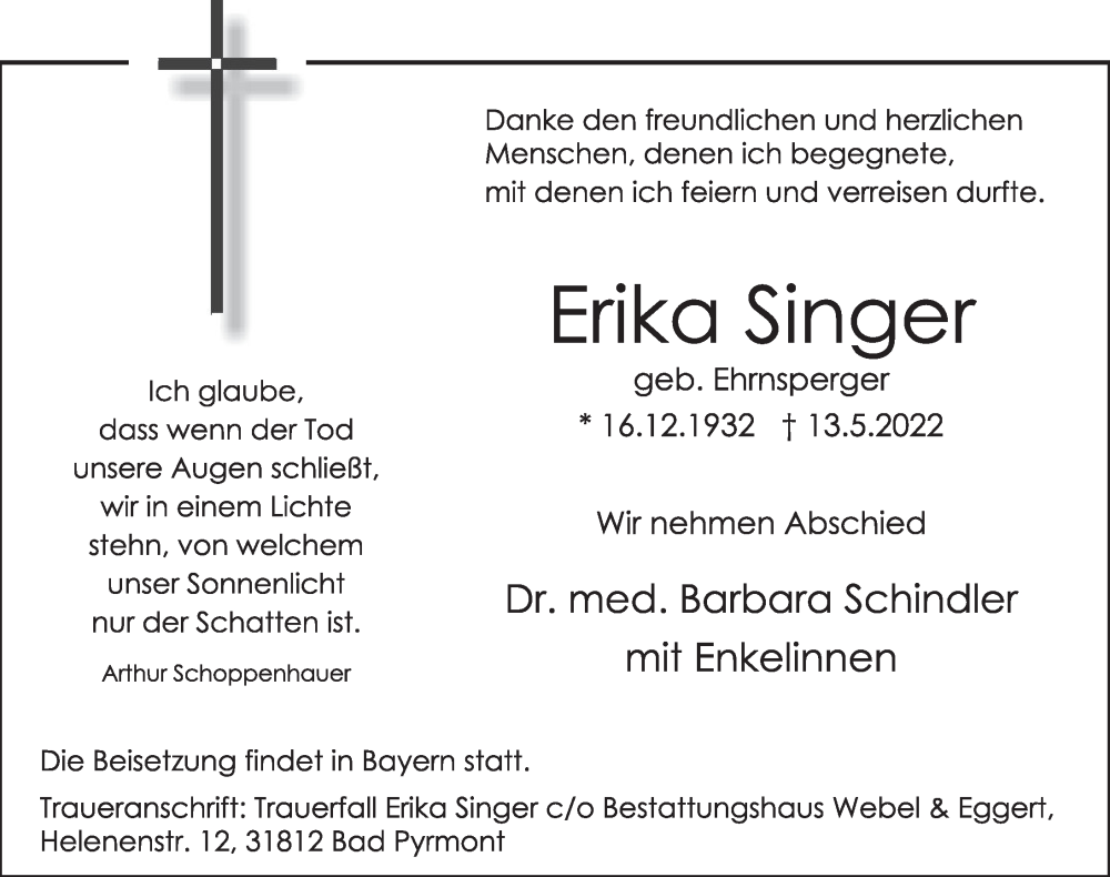 Hier finden Sie alle Traueranzeigen aus der Zeitung, die bisher für Erika Singer erschienen sind. Weitere Traueranzeigen, die in der Zeitung erscheinen, werden hier ebenfalls aufgelistet