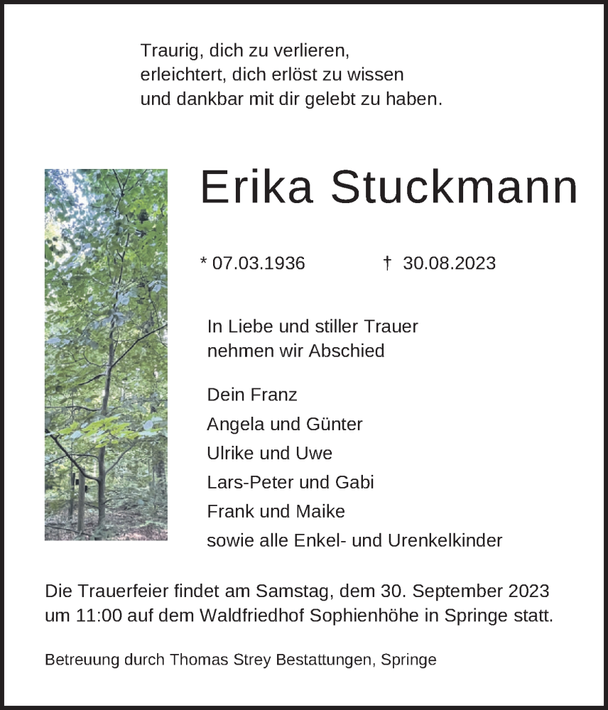 Hier finden Sie alle Traueranzeigen aus der Zeitung, die bisher für Erika Stuckmann erschienen sind. Weitere Traueranzeigen, die in der Zeitung erscheinen, werden hier ebenfalls aufgelistet