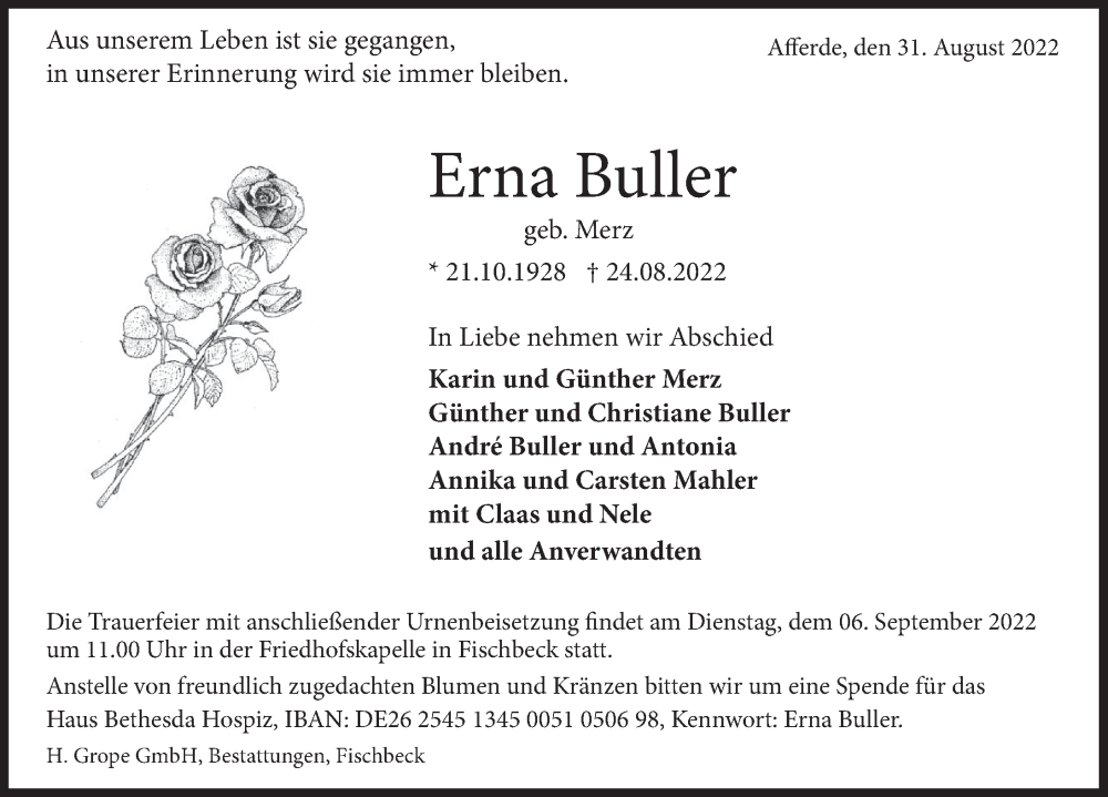 Hier finden Sie alle Traueranzeigen aus der Zeitung, die bisher für Erna Buller erschienen sind. Weitere Traueranzeigen, die in der Zeitung erscheinen, werden hier ebenfalls aufgelistet
