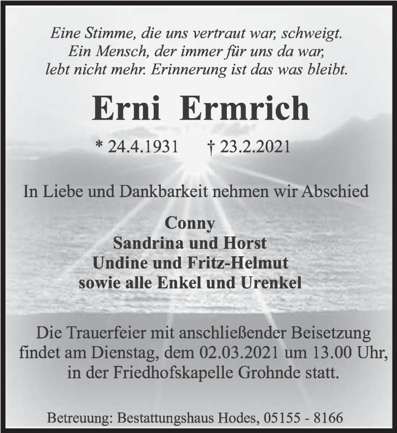 Hier finden Sie alle Traueranzeigen aus der Zeitung, die bisher für Erni Ermrich erschienen sind. Weitere Traueranzeigen, die in der Zeitung erscheinen, werden hier ebenfalls aufgelistet