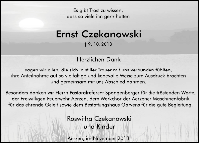 Hier finden Sie alle Traueranzeigen aus der Zeitung, die bisher für Ernst Czekanowski erschienen sind. Weitere Traueranzeigen, die in der Zeitung erscheinen, werden hier ebenfalls aufgelistet