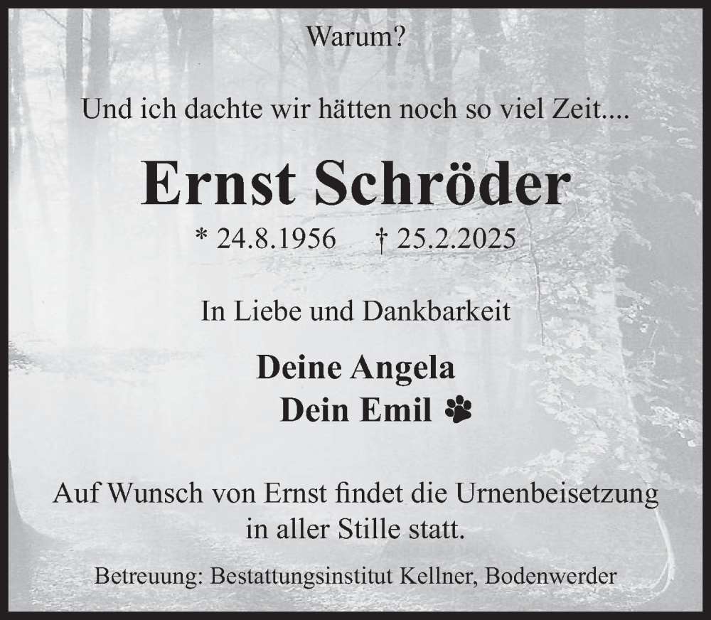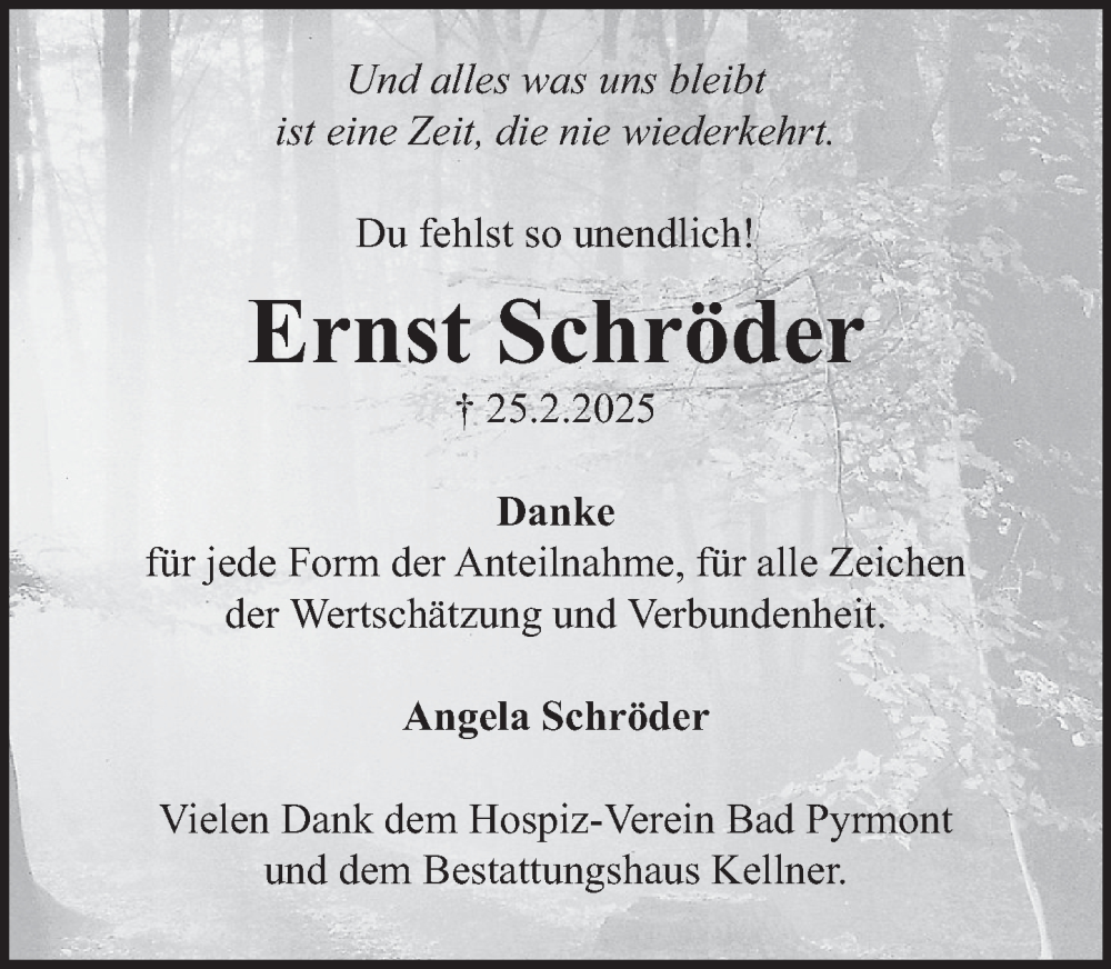Hier finden Sie alle Traueranzeigen aus der Zeitung, die bisher für Ernst Schröder erschienen sind. Weitere Traueranzeigen, die in der Zeitung erscheinen, werden hier ebenfalls aufgelistet
