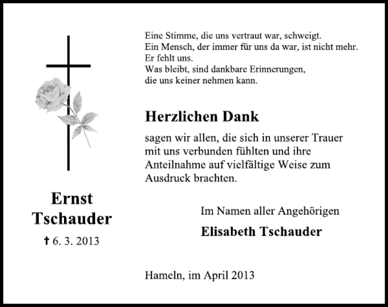 Hier finden Sie alle Traueranzeigen aus der Zeitung, die bisher für Ernst Tschauder erschienen sind. Weitere Traueranzeigen, die in der Zeitung erscheinen, werden hier ebenfalls aufgelistet