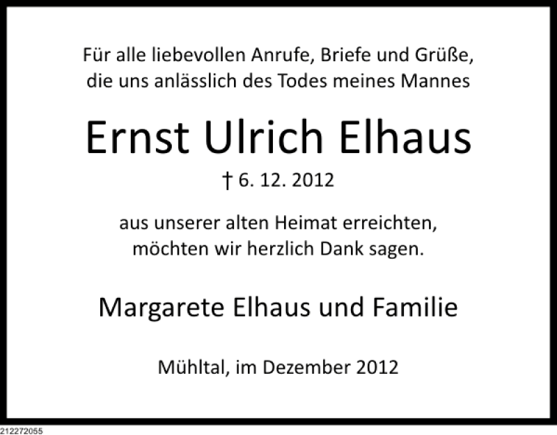 Hier finden Sie alle Traueranzeigen aus der Zeitung, die bisher für Ernst Ulrich Elhaus erschienen sind. Weitere Traueranzeigen, die in der Zeitung erscheinen, werden hier ebenfalls aufgelistet