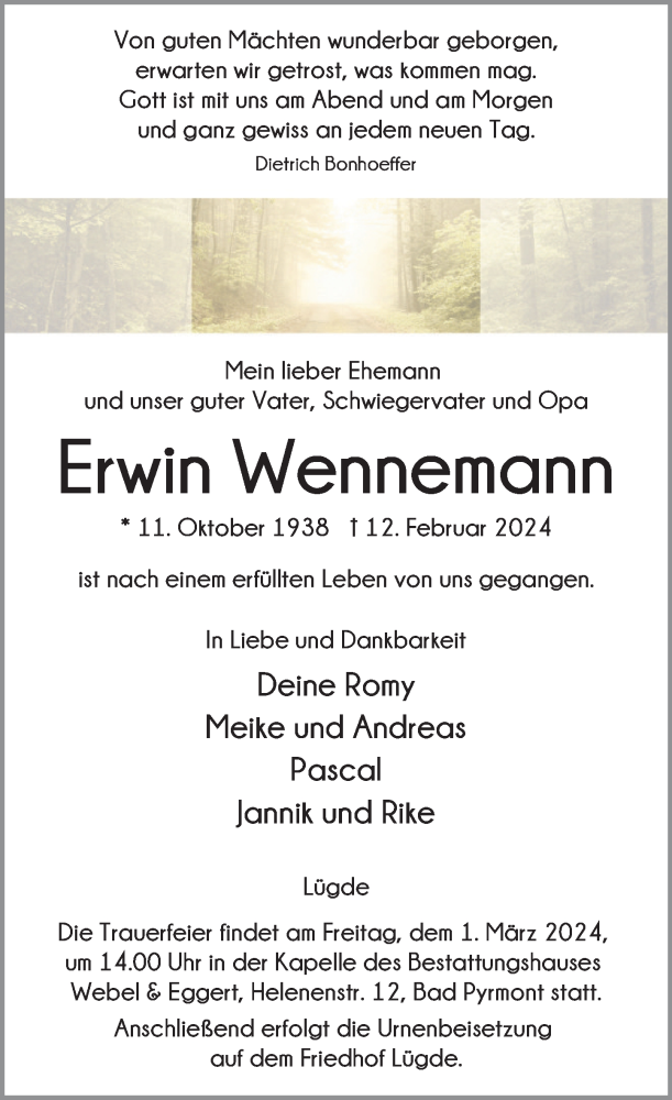 Hier finden Sie alle Traueranzeigen aus der Zeitung, die bisher für Erwin Wennemann erschienen sind. Weitere Traueranzeigen, die in der Zeitung erscheinen, werden hier ebenfalls aufgelistet