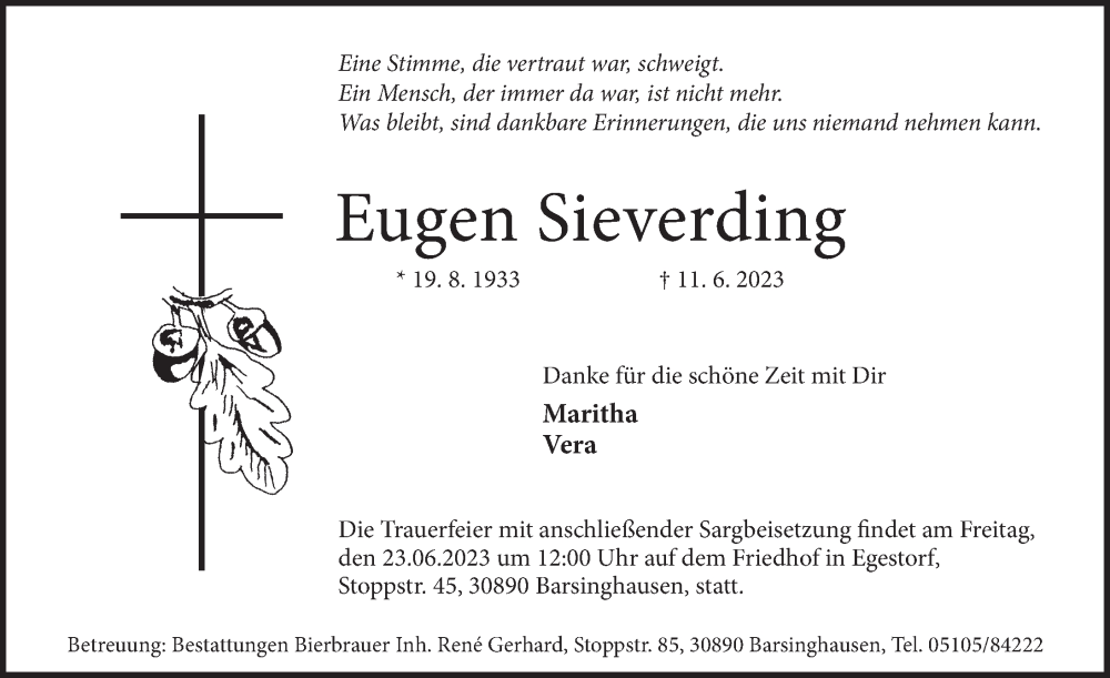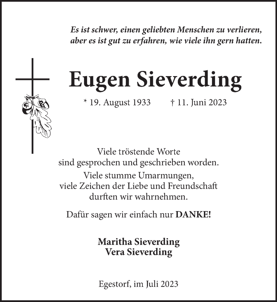 Hier finden Sie alle Traueranzeigen aus der Zeitung, die bisher für Eugen Sieverding erschienen sind. Weitere Traueranzeigen, die in der Zeitung erscheinen, werden hier ebenfalls aufgelistet
