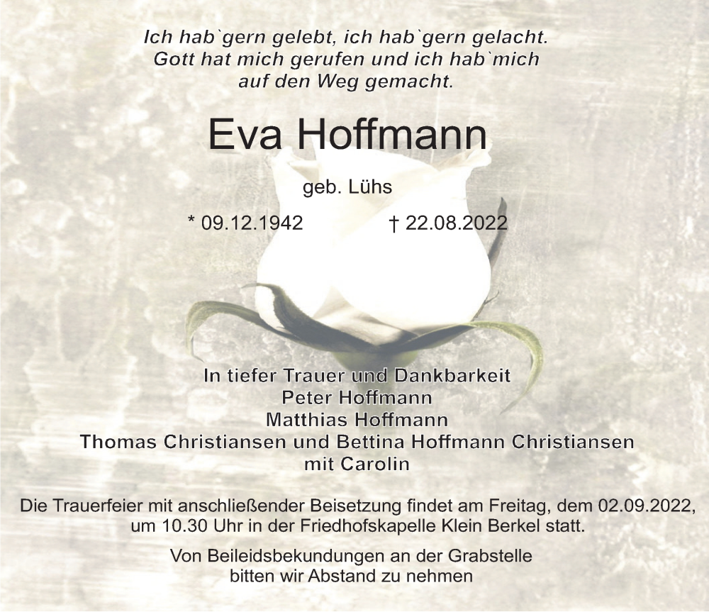 Hier finden Sie alle Traueranzeigen aus der Zeitung, die bisher für Eva Hoffmann erschienen sind. Weitere Traueranzeigen, die in der Zeitung erscheinen, werden hier ebenfalls aufgelistet