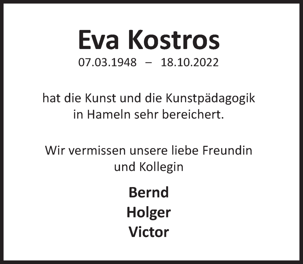 Hier finden Sie alle Traueranzeigen aus der Zeitung, die bisher für Eva Kostros erschienen sind. Weitere Traueranzeigen, die in der Zeitung erscheinen, werden hier ebenfalls aufgelistet