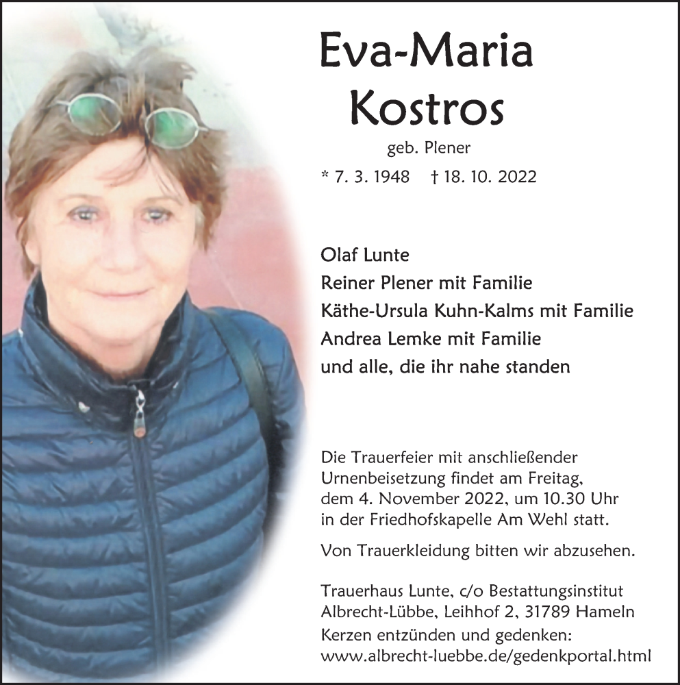Hier finden Sie alle Traueranzeigen aus der Zeitung, die bisher für Eva-Maria Kostros erschienen sind. Weitere Traueranzeigen, die in der Zeitung erscheinen, werden hier ebenfalls aufgelistet