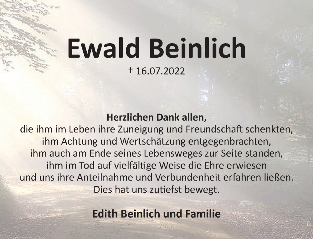 Hier finden Sie alle Traueranzeigen aus der Zeitung, die bisher für Ewald Beinlich erschienen sind. Weitere Traueranzeigen, die in der Zeitung erscheinen, werden hier ebenfalls aufgelistet