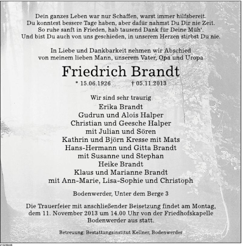 Hier finden Sie alle Traueranzeigen aus der Zeitung, die bisher für Firiedrich Brandt erschienen sind. Weitere Traueranzeigen, die in der Zeitung erscheinen, werden hier ebenfalls aufgelistet