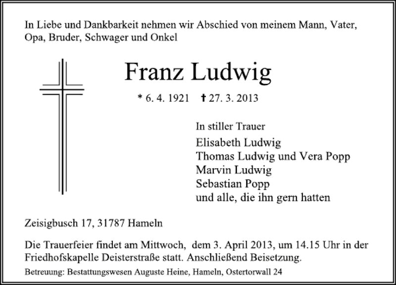 Hier finden Sie alle Traueranzeigen aus der Zeitung, die bisher für Franz Ludwig erschienen sind. Weitere Traueranzeigen, die in der Zeitung erscheinen, werden hier ebenfalls aufgelistet