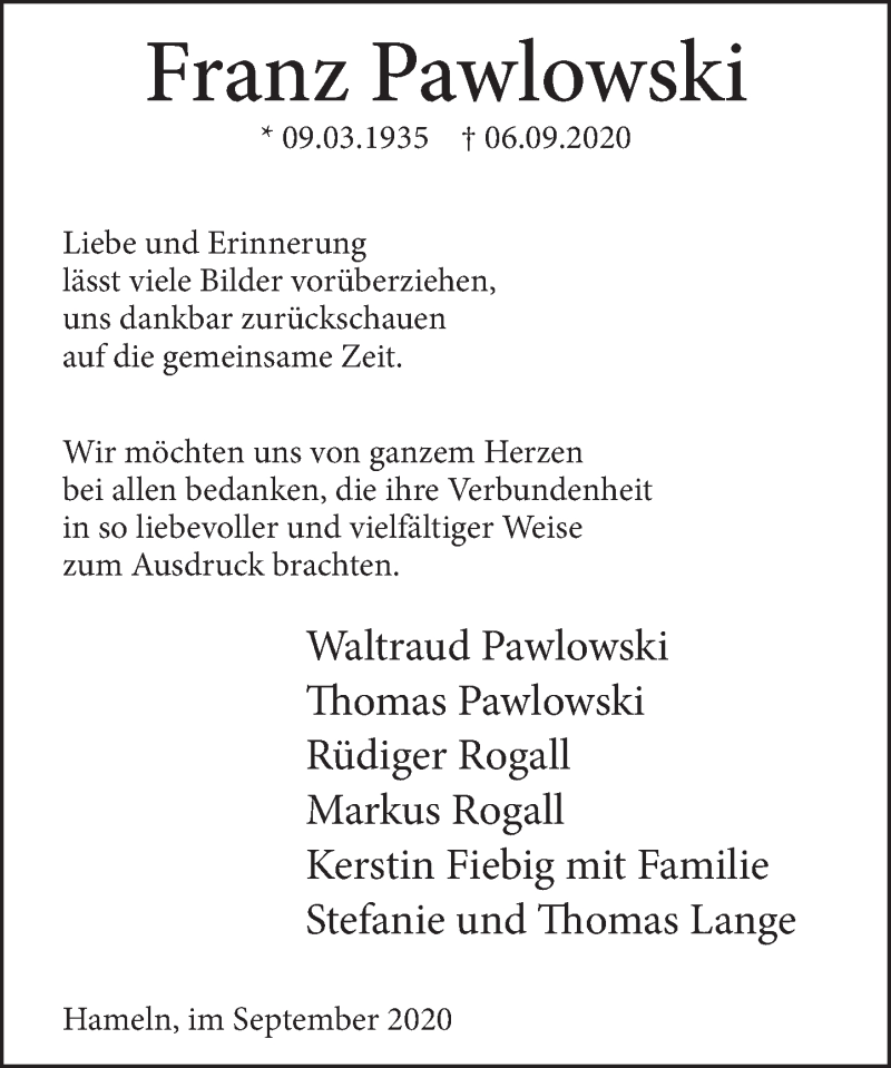 Hier finden Sie alle Traueranzeigen aus der Zeitung, die bisher für Franz Pawlowski erschienen sind. Weitere Traueranzeigen, die in der Zeitung erscheinen, werden hier ebenfalls aufgelistet