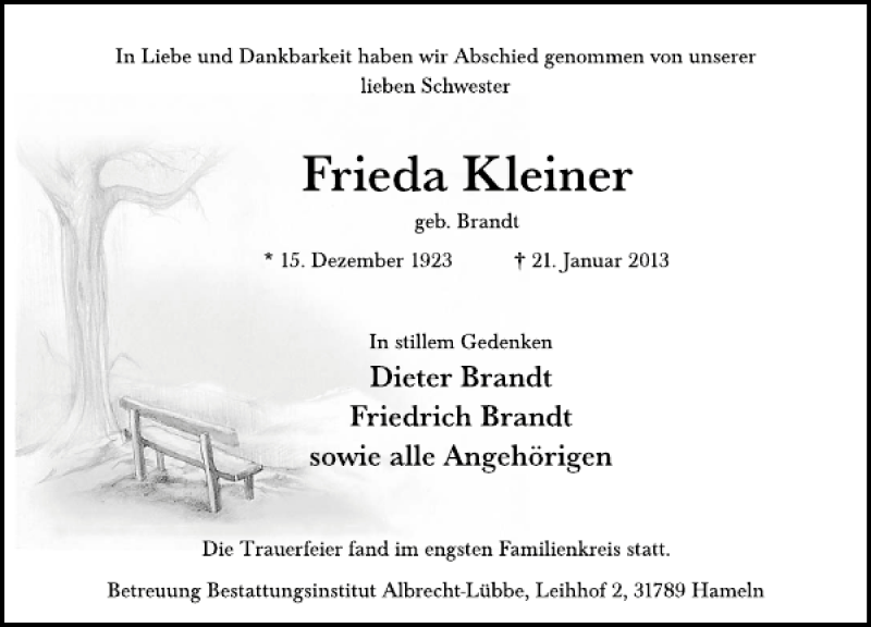 Hier finden Sie alle Traueranzeigen aus der Zeitung, die bisher für Frieda Kleiner erschienen sind. Weitere Traueranzeigen, die in der Zeitung erscheinen, werden hier ebenfalls aufgelistet
