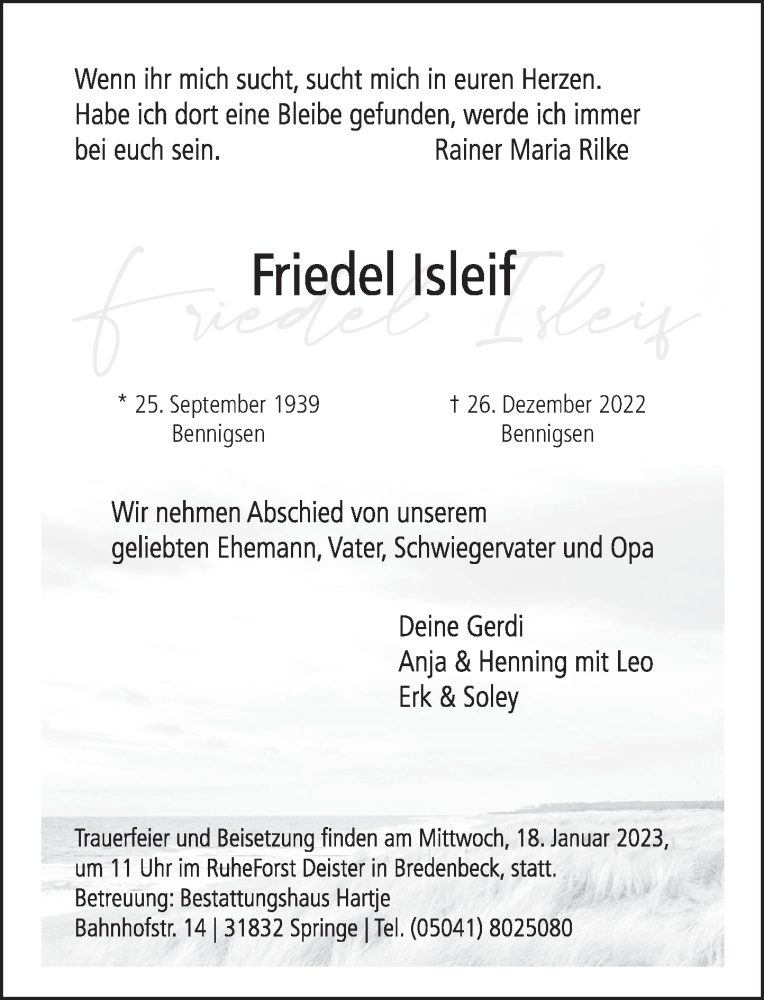 Hier finden Sie alle Traueranzeigen aus der Zeitung, die bisher für Friedel Isleif erschienen sind. Weitere Traueranzeigen, die in der Zeitung erscheinen, werden hier ebenfalls aufgelistet