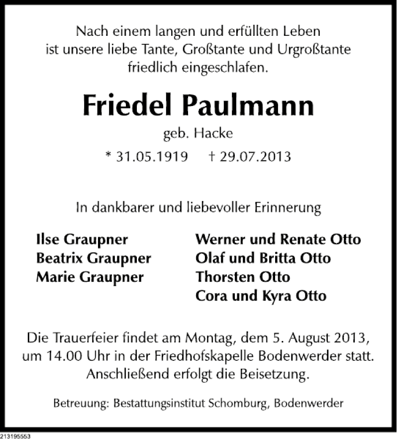 Hier finden Sie alle Traueranzeigen aus der Zeitung, die bisher für Friedel Paulmann erschienen sind. Weitere Traueranzeigen, die in der Zeitung erscheinen, werden hier ebenfalls aufgelistet
