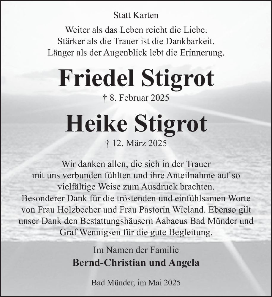Hier finden Sie alle Traueranzeigen aus der Zeitung, die bisher für Friedel Stigrot erschienen sind. Weitere Traueranzeigen, die in der Zeitung erscheinen, werden hier ebenfalls aufgelistet