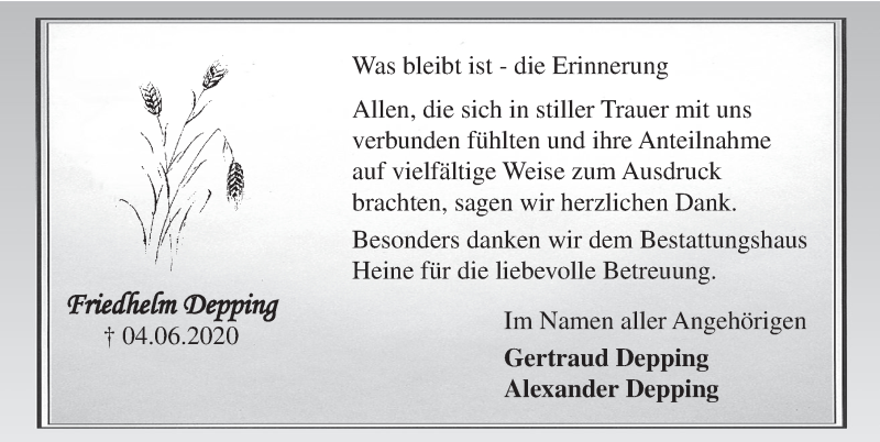 Hier finden Sie alle Traueranzeigen aus der Zeitung, die bisher für Friedhelm Depping erschienen sind. Weitere Traueranzeigen, die in der Zeitung erscheinen, werden hier ebenfalls aufgelistet