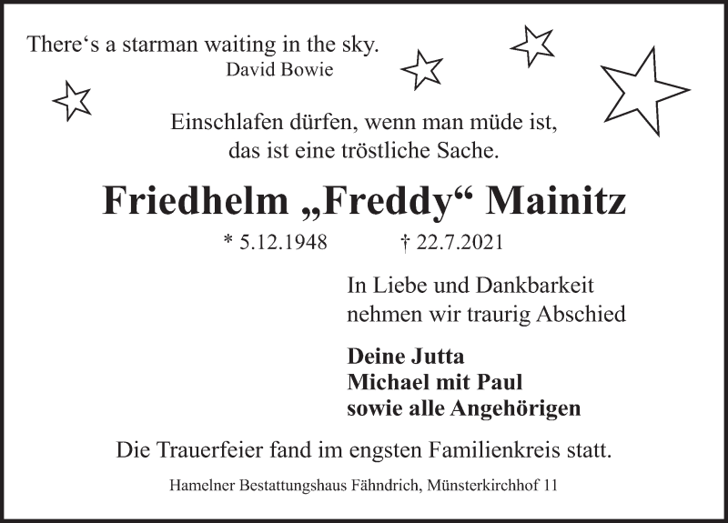 Hier finden Sie alle Traueranzeigen aus der Zeitung, die bisher für Friedhelm Mainitz erschienen sind. Weitere Traueranzeigen, die in der Zeitung erscheinen, werden hier ebenfalls aufgelistet